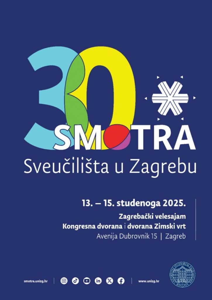 s velikim zadovoljstvom vas obavještavamo da će se jubilarna 30. Smotra Sveučilišta u Zagrebu održavati od četvrtka 13. do subote 15. studenoga 2025. u Kongresnome centru Zagrebačkoga velesajma (Avenija Dubrovnik 15, Zagreb – ulaz uz Gastro Globus).
