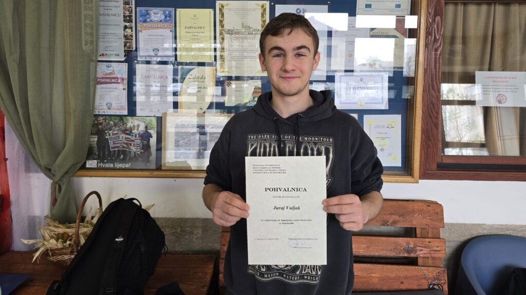 Juraj Vuljak – učenik 2.c razreda na Županijskom natjecanju iz Osnova informatike – kategorija srednje strukovne škole osvojio je drugo mjesto. Time se plasirao na Državno natjecanje iz informatike koje će se održati u Vodicama od 14. do 17. travnja.