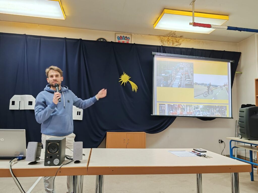 Početak projekta obilježili smo 26. ožujka 2026. godine kada nas je posjetio Robert Medvedec, predsjednik udruge Sindikat biciklista. Predavanju o važnosti korištenja bicikla kao prijevoznog sredstva slušali su učenici 1. razreda, polaznici fakultativnog predmeta Škola i zajednica i drugi zainteresirani učenici.